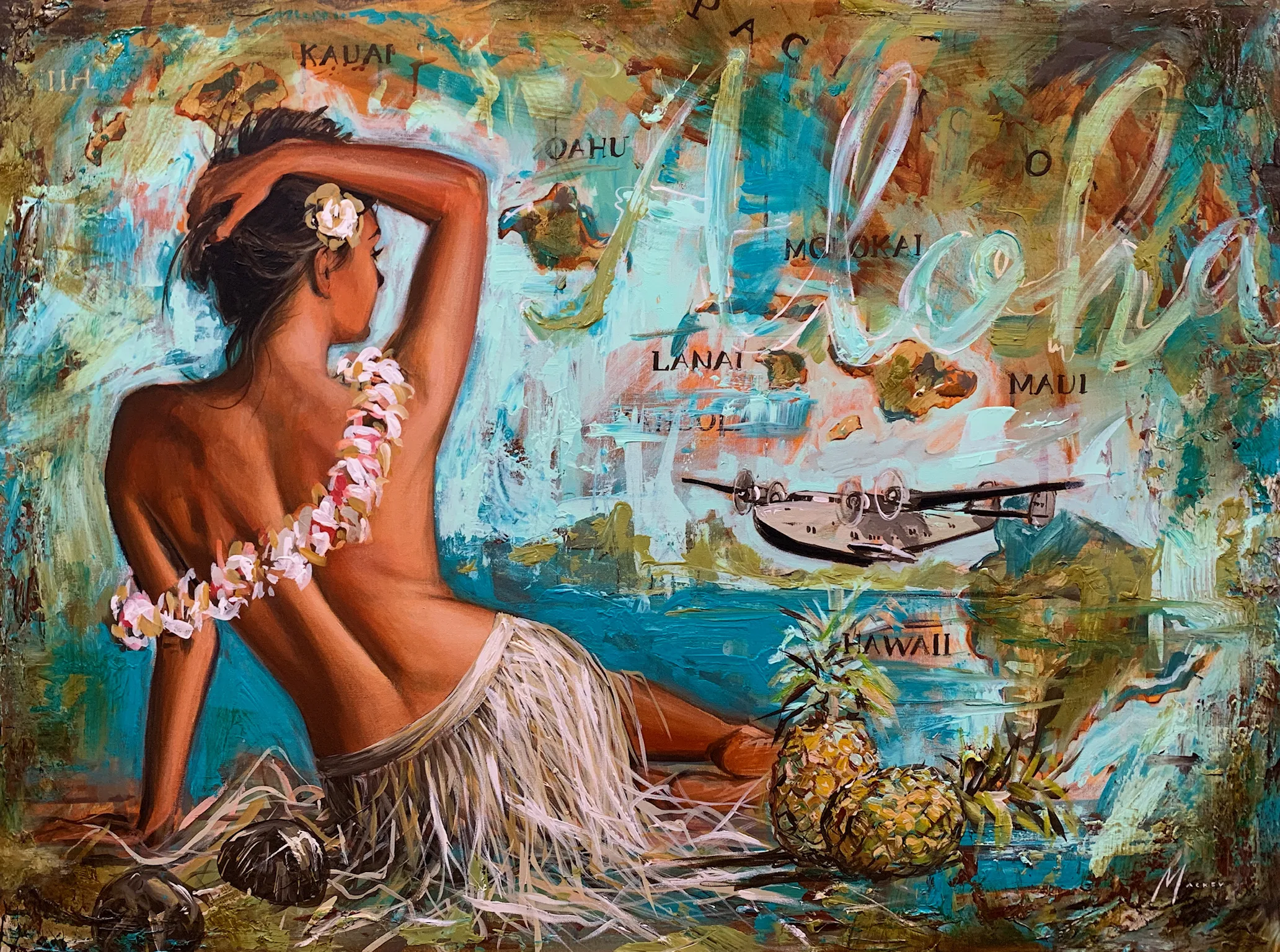 This painting depicts a woman sitting on the ground in a grass skirt. She is wearing a flower necklace around her neck and has an expression of contentment on her face. The background of the painting consists of a beach with pineapples scattered across it, as well as an airplane flying overhead. The colors used are mostly browns and greys, giving the painting an earthy feel.